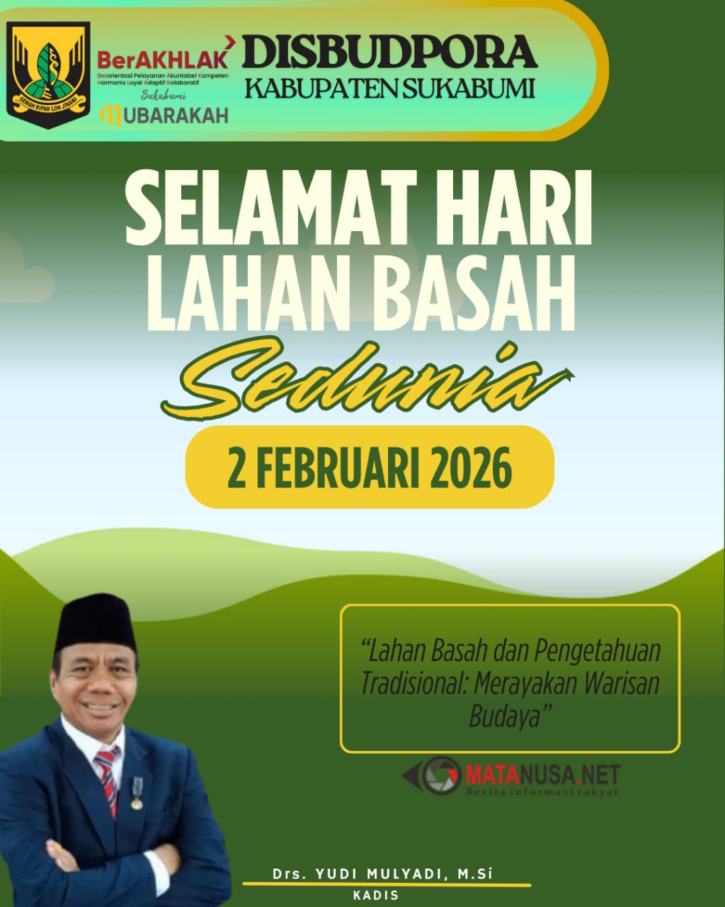 Sukabumi | Matanusa.net – Dinas Kebudayaan, Pemuda, dan Olahraga (Disbudpora) Kabupaten Sukabumi turut memperingati Hari Lahan Basah Sedunia yang diperingati setiap 2 Februari, sebagai momentum untuk menegaskan pentingnya pelestarian lahan basah sebagai bagian dari warisan budaya dan ruang pembelajaran bagi generasi muda.