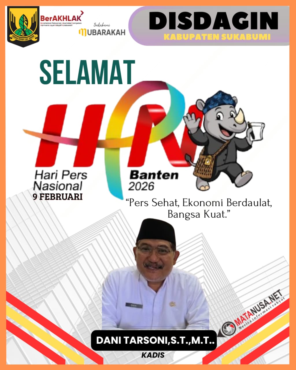 Sukabumi | Matanusa.net – Kepala Dinas Perdagangan dan Perindustrian (Disdagin) Kabupaten Sukabumi, Dani Tarsoni, S.T., M.T., menyampaikan ucapan Selamat Hari Pers Nasional (HPN) Tahun 2026 yang diperingati pada 9 Februari 2026. Peringatan HPN tahun ini mengusung tema “Pers Sehat, Ekonomi Berdaulat, Bangsa Kuat” dan dilaksanakan secara nasional di Provinsi Banten.