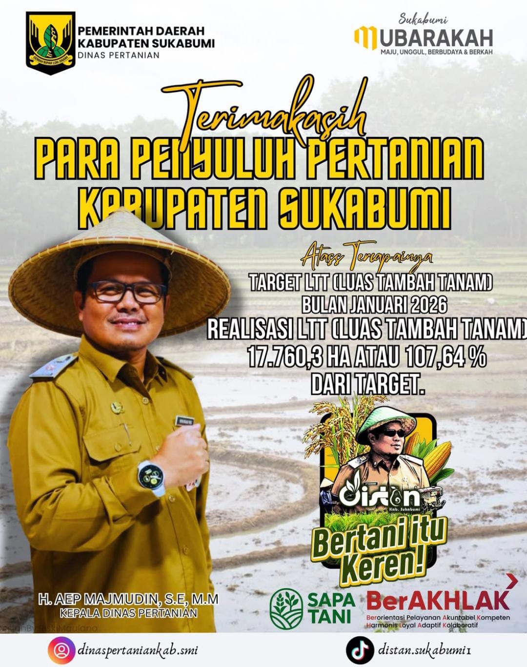 Dengan capaian LTT yang melampaui target di awal tahun 2026 ini, Dinas Pertanian Kabupaten Sukabumi optimistis sektor pertanian akan terus tumbuh positif dan memberikan kontribusi nyata bagi perekonomian daerah.