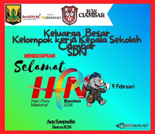 Sukabumi | Matanusa.net – Keluarga besar Kelompok Kerja Kepala Sekolah (K3S) SDN Ciambar menyampaikan ucapan Selamat Hari Pers Nasional (HPN) Tahun 2026 yang diperingati pada 9 Februari 2026. Peringatan HPN tahun ini mengusung tema “Pers Sehat, Ekonomi Berdaulat, Bangsa Kuat” dan dilaksanakan secara nasional di Provinsi Banten.