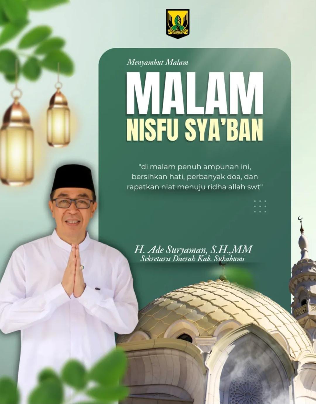 Sekretaris Daerah Kabupaten Sukabumi, H. Ade Suryaman, S.H., M.M, mengajak seluruh masyarakat Kabupaten Sukabumi untuk memaknai Malam Nisfu Sya’ban dengan meningkatkan kualitas ibadah dan memperkuat niat dalam menjalani kehidupan yang lebih baik.