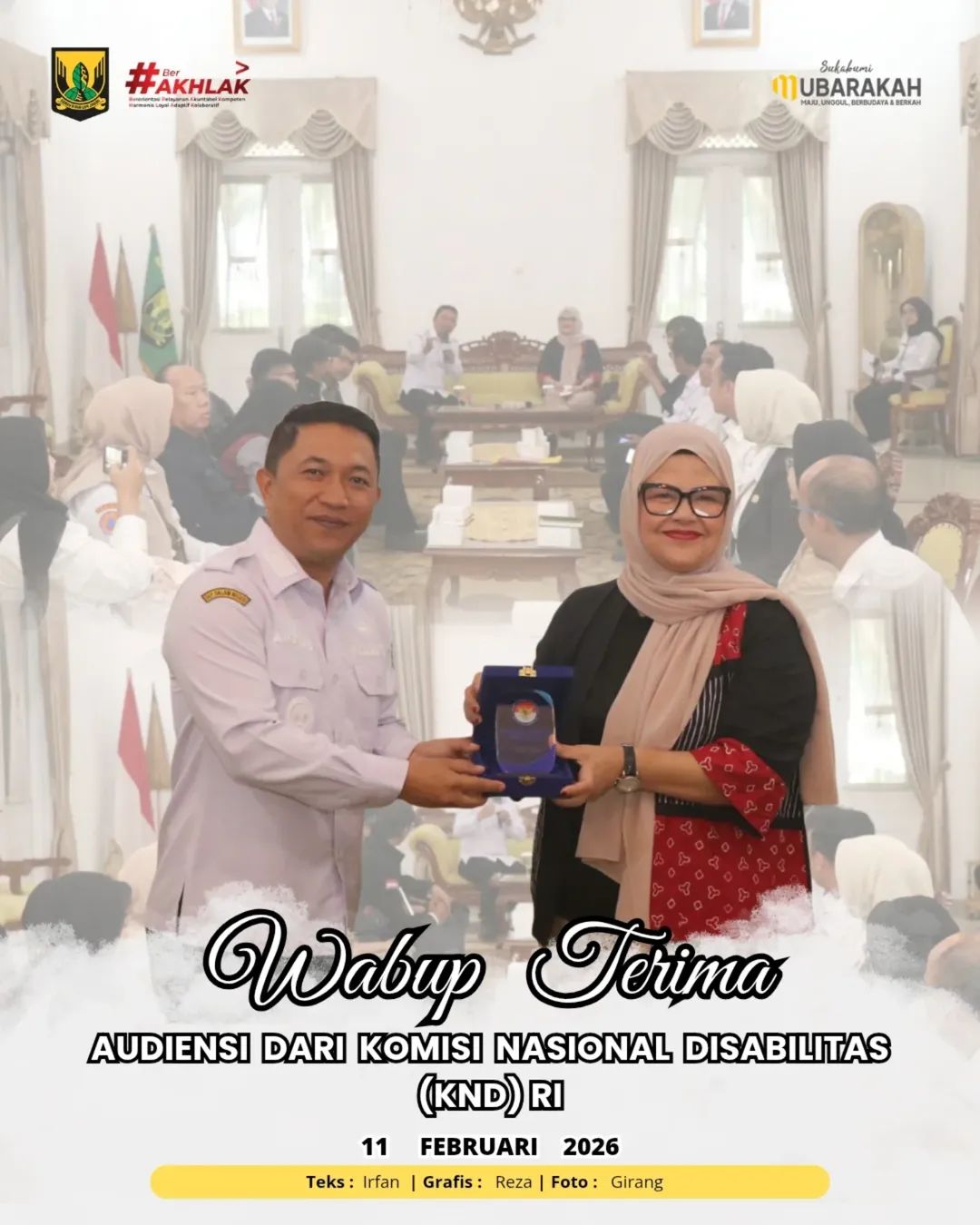 Sukabumi | Matanusa.net– Wakil Bupati Sukabumi H. Andreas menerima audiensi sekaligus berdiskusi secara konstruktif bersama Komisi Nasional Disabilitas (KND) Republik Indonesia di Pendopo Sukabumi, pada Rabu (11/02/2026). Pertemuan tersebut menjadi momentum penting dalam memperkuat komitmen daerah terhadap pemenuhan hak-hak penyandang disabilitas.