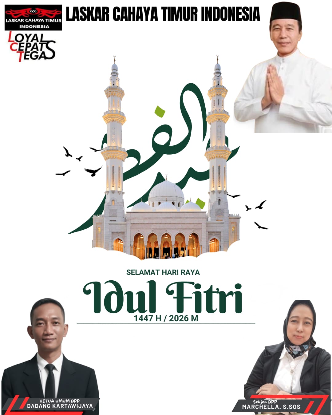 Ucapan Idul Fitri tersebut disampaikan langsung oleh jajaran pimpinan, di antaranya Ketua Umum DPP Dadang Kartawijaya serta Sekretaris Jenderal DPP Marchella, S.Sos. Keduanya mengajak seluruh masyarakat untuk menjadikan momen Idul Fitri sebagai ajang mempererat tali silaturahmi, saling memaafkan, serta meningkatkan rasa kepedulian sosial.