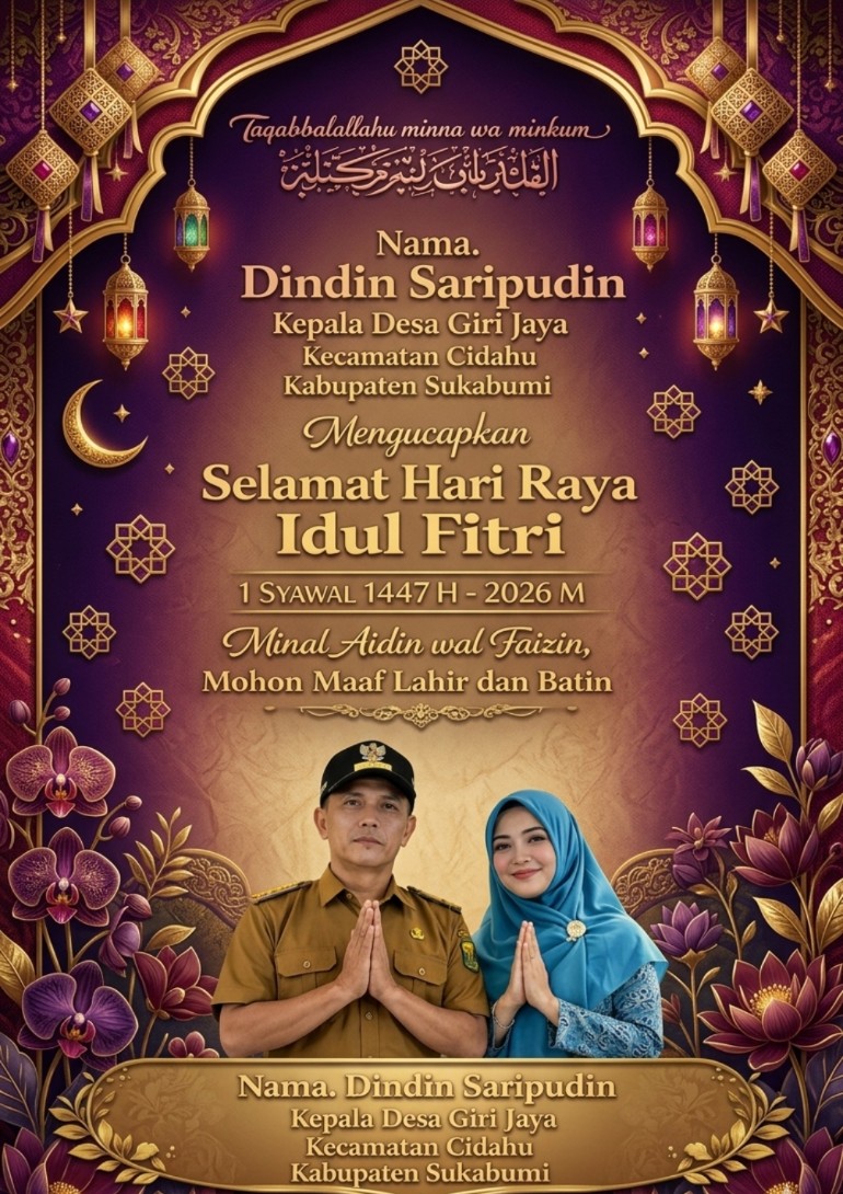 Sukabumi | Matanusa.net – Dalam rangka menyambut Hari Raya Idul Fitri 1 Syawal 1447 Hijriah atau tahun 2026 Masehi, Kepala Desa Giri Jaya, Kecamatan Cidahu, Kabupaten Sukabumi, Dindin Saripudin, menyampaikan ucapan selamat kepada seluruh masyarakat.