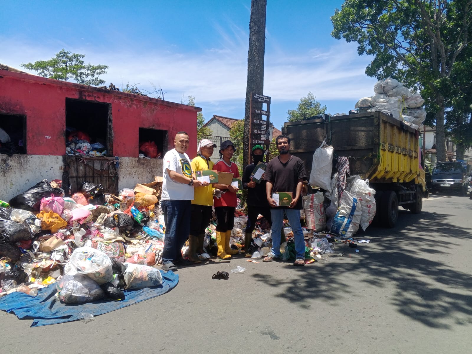 LSM Dampal Jurig menyalurkan bantuan paket sarung dan santunan kepada para petugas pengangkut sampah dari Dinas Lingkungan Hidup Kabupaten Sukabumi di Kadudampit. (Foto: R. Iyan Satria).