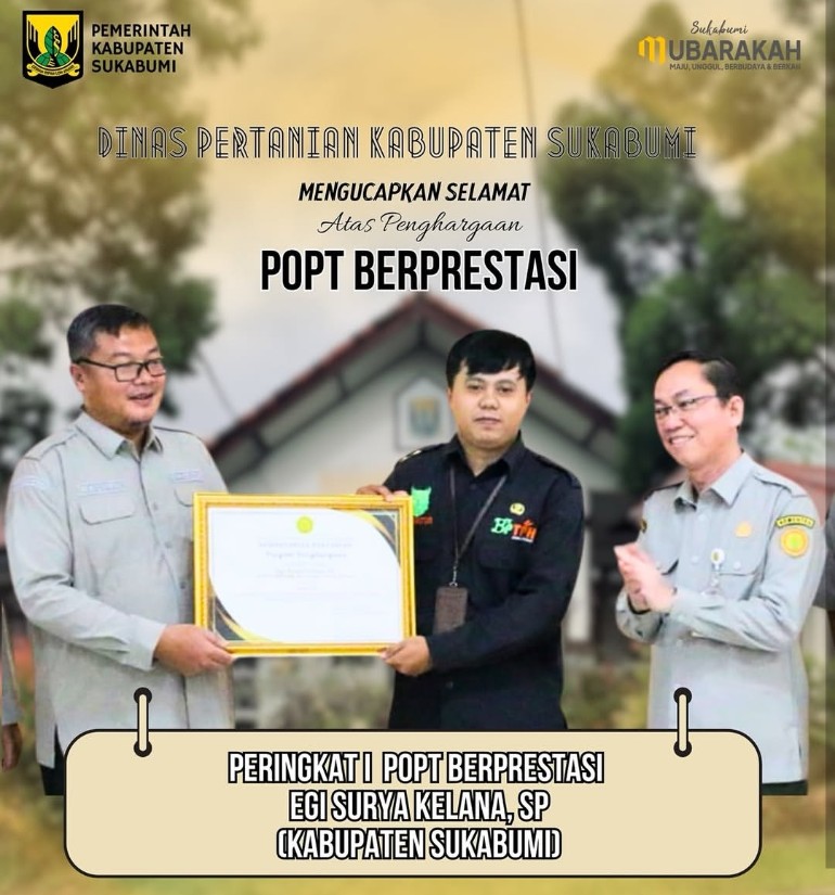Sukabumi | Matanusa.net — Kabar membanggakan datang dari Dinas Pertanian Kabupaten Sukabumi di awal tahun 2026. Salah satu Petugas Pengendali Organisme Pengganggu Tumbuhan (POPT), Egi Surya Kelana, SP, berhasil meraih penghargaan Juara 1 Nasional kategori POPT Berprestasi tahun 2025.
