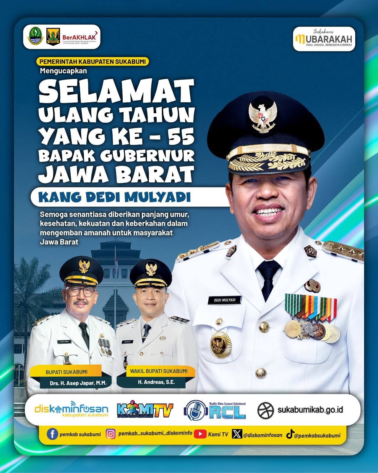 Sukabumi | Matanusa.net – Pemerintah Kabupaten Sukabumi menyampaikan ucapan selamat ulang tahun ke-55 kepada Gubernur Jawa Barat, Dedi Mulyadi. Ucapan tersebut disampaikan sebagai bentuk penghormatan sekaligus doa atas pengabdian beliau dalam memimpin Provinsi Jawa Barat.